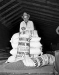 Image shows W. P. Martin leaning over a hand truck loaded with crop of 30,000 sacks of seed. He appears to be standing in a storage facility. Published in the Fort Worth Star-Telegram morning edition, October 1, 1950.