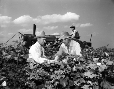 Image shows Lubbock County Agent David Sherrill showing J. P. Martin, right a bollworm in the Martin cotton crop. Behind them is unidentified man riding tractor. Published in the Fort Worth Star-Telegram morning edition, October 1, 1950.