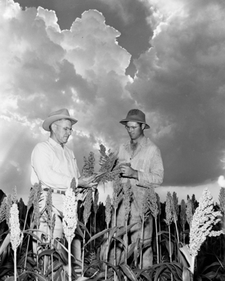 Image shows W. P. Martin left, and J. P. Martin, right, in maize field. Both men are shown inspecting maize, to be bred into their standard milo. Published in the Fort Worth Star-Telegram morning edition, October 1, 1950.