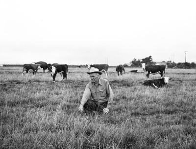 Image shows J. P. Steele in irrigated pasture, where 92 head of cattle are grazing on 32 acres. Some of the cattle is shown grazing behind Steele. Published in the Fort Worth Star-Telegram morning edition, October 1, 1950.