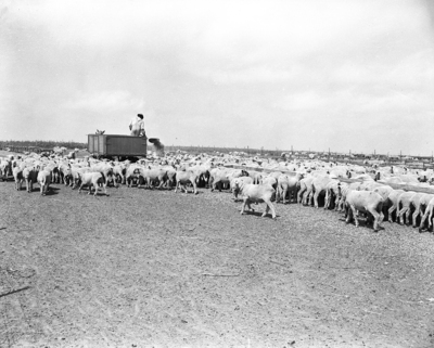 Image shows a lamb feedlot on O. A. Woody farm near Shallowater. A feed wagon, with a unidentified worker, shoveling feed in troughs. The lambs are fattened on Plains feed, shipped to Kansas City and Fort Worth. Published in the Fort Worth Star-Telegram , November 5, 1950.