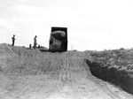 Image shows a truck dumping a load of chopped up silage in a trench silo. The two unidentified workmen left of truck will pack silage with tractors. Published in the Fort Worth Star-Telegram , November 5, 1950.