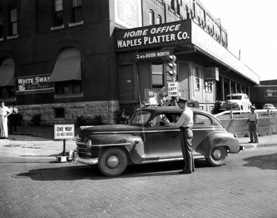 Mrs. Lucille Womble, in a car and Patrolman T. W. Curtis at the corner of Jones Street and Calhoun Street, Fort Worth, Texas.