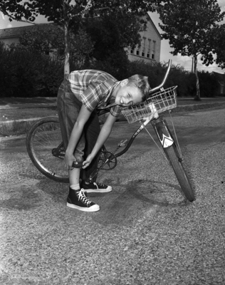 Pictured here is Tim Cockburn rolling up his pants next to his bicycle.