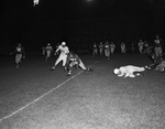 Action shots of tight end Dick Berger (72) of Woodrow Wilson is about to fall on a Paschal fumble in the game. A shoe-string tackle caused Panther Back Johnny Cozart, on ground, to lose possession of the ball after making seven yards. Jack Legate (31) arrives too late to contest for ball. Paschal won 41-6. Published in Fort Worth Star-Telegram morning edition September 16, 1950.
