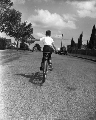 Pictured here is Vernon Young demonstrating a hand signal for turning on his bicycle.