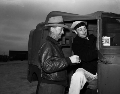 Drivers John T. McNeely, left, and W. L. Jenkins placed the first of 25 Town and Country Club membership stickers on the windshield of a Quartermaster Depot truck after the military supply center threw its support behind the city-wide safely drive.