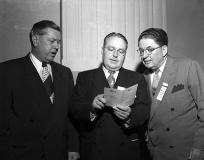 A trio of officials of Nash Motors were in a huddle at Will Rogers Memorial Coliseum while inspecting a printed program for a meeting of Dallas area dealers. Left to right, L. T. Kouns, Detroit, western sales manager, H. S. Baker, Dallas area manager, and R. R. Compton, St. Louis, Midwest regional manager.
