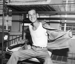 Pfc. R. O. Pettigrew, happily yanked off his marine dungarees after being deferred from active duty because of his B-36 job at Convair. He already had packed his gear and is ready for air transportation away from Grand Prairie Naval Air Station with his marine reserve unit.