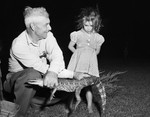 Marian Alice Jones, 5, takes a last look at the three-foot alligator held by her grandfather, J. B. Jones, 4749 Normandy Road, before Forest Park Zoo attendants arrived to take it. The alligator, believed to come from the river bottoms, startled Jones' neighbor, Mrs. Nelle Walker, by crawling into her house the previous weekend. Published in Fort Worth Star-Telegram evening edition September 19, 1950.