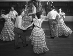 Swinging into an opening maneuver as they prepare themselves for competition in the Southwestern Exposition and Fat Stock Show square dance contest here are Fort Worth's Grand Square Set members Bob Calder and Mrs. Ted Reeves at left, Raymond Pendery and Mrs. John Morris in center foreground. Mrs. Pendery and Morris in background and Reeves and Mrs. Calder at right.