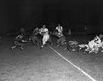 Gene Boyd (31), Abilene's 175-pound back, is brought to a halt on his own 33-yard line after a 23-yard run back on a kickoff in the second quarter of the game at Farrington Field. Tackler grasping him from behind is Arlington Heights' John Fox. At left, helping, is Kenneth Harlow, while Charles Spencer comes up at right. The Jackets on a 33-21 thriller in the first game. Published in Fort Worth Star-Telegram morning edition September 16, 1950.