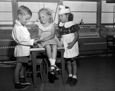 Pictured here, from left to right, is Richard Hill Rowe, Camilla Cosby, and Mary Margaret McPherren. They are pupils in the Mary Louise Phillips Elementary School kindergarten, where a daily check on clean hands, teeth, necks, and ears is taking place.