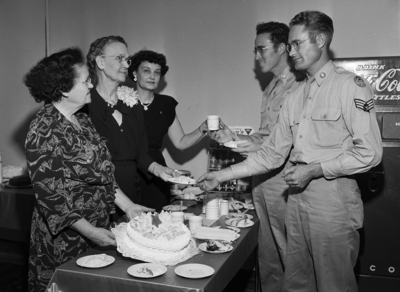 Pictured here are two Carswell Air Force Base airmen being served coffee and cake by members of the Fort Worth chapter of American Gold Star Mothers, Inc., at the Armed Forces Service Center. Those in this photo, from left to right, are Mrs. C. R. Woods, Mrs. M. Pollard, chapter chairman, Mrs. R. E. Weatherbee, Corporal Richard Stanberry, and Sergeant James Mock.