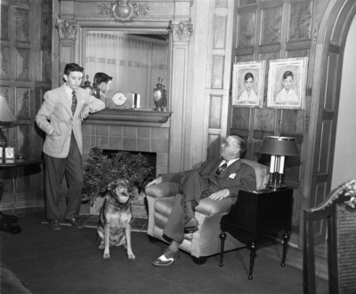 SumterT. Bibb Jr. and son Tommy with dog "Cappy" in library of their home, the C. O. Edwards' house, 39 Valley Ridge Road, formerly the J. B. Slaughter home originally built on Summit Avenue, Fort Worth, Texas.