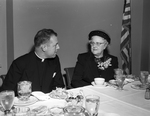 Mrs. Jack Wolf of Texarkana, nominee for re-election as president of the Dallas Diocese, National Council of Catholic Women, visits with Msgr. W. J. Bender of Dallas, the organization's moderator, during a pre-convention dinner and board session at Hotel Texas.