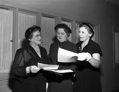 Pictured here checking plans for the annual convention of the Dallas Diocese, National Council of Catholic Women is Mrs. Charles Faust, of Fort Worth, left, Mrs. D. B. Beyhan, of Fort Worth, center, and Mrs. Tony Korioth, of Sherman, right.