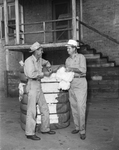 Pictured here is Mr. Guy Bell Jr., left, of Haslet, and W. H. Ritchey, right. Mr. Bell, received $150 in cash and merchandise at the Farm and Ranch Club meeting at Hotel Texas for raising this bale of cotton, Tarrant County's first of the year.