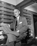 Pictured here is Mr. John G. McDevitt, United States sales manager for the British firm of Hunt & Winterbotham, displays swatches of authentic Scottish district checks during his visit to John L. Ashe here.