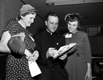 Pictured here from left to right is Mrs. Mary Belle Cummings, Reverend Vincent J. Wolf, and Mrs. L. R. Cox. Reverend Wolf, pastor of the Immaculate Conception Church at Tyler, looks over the program of the annual convention of the Dallas diocese, National Council of Catholic Women, with two the two delegates.
