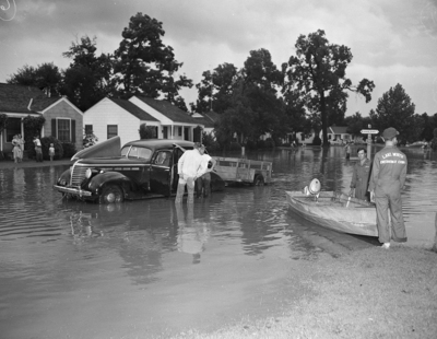 Two members of the Lake Worth emergency crew stood by their boat on Templeton Drive as a stalled motorist was pulled out of high water.
