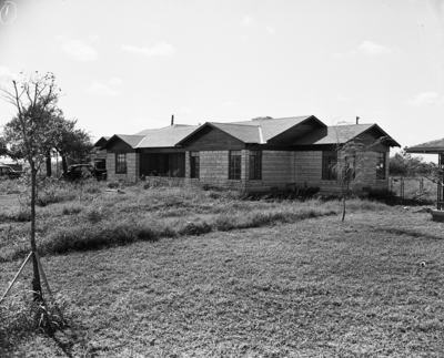 Exterior of the Austin stone house, new home of Mr. and Mrs. Lorin Brown in Richland Hills, built by Brown's own hands. Published in the Fort Worth Star - Telegram morning edition, September 24, 1950.