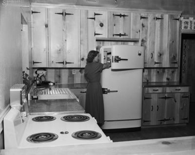 Mrs. Brown is shown in the kitchen, which is equipped with all modern appliances. Published in the Fort Worth Star - Telegram morning edition, September 24, 1950.