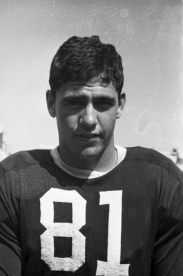 Image of Charles Rogers, tight end, for Texas Christian University. One of eight TCU linemen that probably will get into the lineup at Lawrence, Kansas, when the Frogs open their 1950 football schedule against Kansas University. Published in Fort Worth Star-Telegram morning edition September 20, 1950.