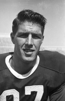Image of Bob Blair, tight end, for Texas Christian University. One of eight TCU linemen that probably will get into the lineup at Lawrence, Kansas, when the Frogs open their 1950 football schedule against Kansas University. Published in Fort Worth Star-Telegram morning edition September 20, 1950.