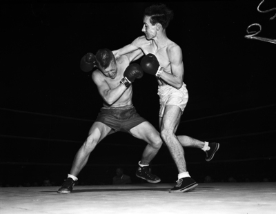 William Brasher, left, of Weatherford ducks away from a right hand tossed by Don Watson of Convair in their bout. Watson won a punch-filled battle on points. They are novice welters. Published in the Fort Worth Star-Telegram evening edition, January 20, 1950.