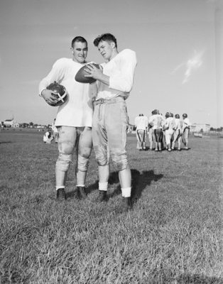 Dan Powell, right, Archer City, and Daniel Hallmark, power runner from Ballinger, are two outstanding backs among a strong squad of Texas Christian University freshmen football players this year. Published in Fort Worth Star-Telegram morning edition September 21, 1950.