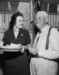 Miss Elizabeth Gann of 238 Bailey, law graduate, breaks bread and samples cheese with Morgan Bryan, a courtroom campaigner with 59 years of law to his credit, at Fort Worth and Tarrant County Bar Association's annual barbecue. Published in the Fort Worth Star - Telegram morning edition, September 22, 1950.
