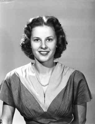 Image shows a bust shot of Roberta Andrews, society reporter. She is the daughter of R. Usher Andrews, 2540 Wabash. She attended Gulf Park Junior College in Gulfport, Mississippi and is a journalism graduate from the University of Texas. She was a member of the Daily Texan and an Alpha Delta Pi (ADPI) sorority. Published in the Fort Worth Star-Telegram October, 1950.