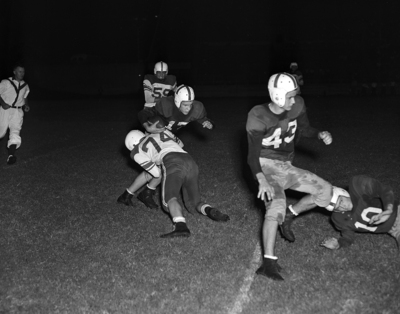 Bill Sharpe (17) of Amon Carter riverside is halted by Clyde Stinson (74) of Paris in second quarter of the game at Farrington Field. That's Jimmy Sweeney (59) coming up to aid Stinson. Paris won, 19-12. Published in Fort Worth Star-Telegram evening edition September 22, 1950.