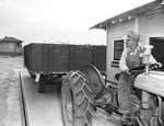 Image shows Ovid Hobson on tractor, weighing a load of cotton at gin. Hobson got insect control ball introduced in Wilbarger County's Odell community. Published in the Fort Worth Star-Telegram morning edition, October 1, 1950.