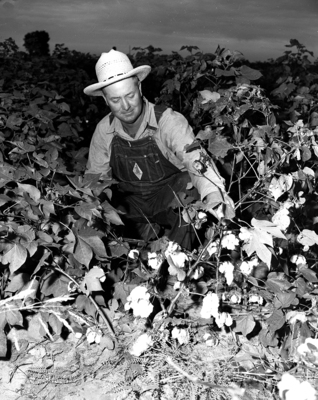 Image shows Aubrey Bell examining cotton stalk in a field. Published in the Fort Worth Star-Telegram morning edition, October 1, 1950.