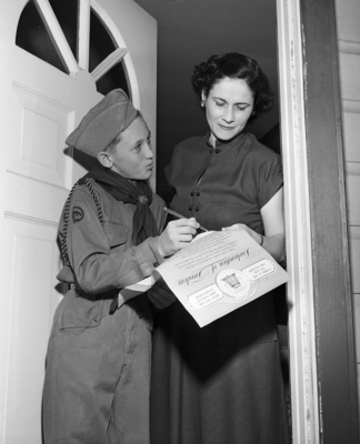Larry Smith, 13-year-old Boy Scout, explains the signing of the Crusade for Freedom blank to Mrs. Jack McNiel in the Scout doorbell campaign. Mrs. McNiel's signature was the 66th in the campaign.