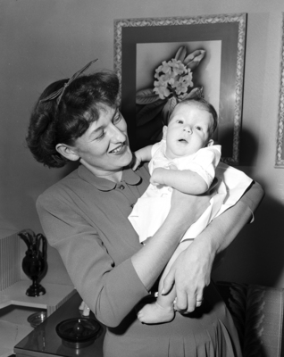 Image shows Janice Williams, former Senior staff member, holding her son, Paul Williams III, for his first Star- Telegram portrait. Published in the Fort Worth Star-Telegram October, 1950.