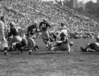 John Medanich, Texas Christian University back, crashes to the two-yard line to set up TCU's first touchdown against Kansas in the game at Lawrence. Making the tackle is Kansas' Hal Cleavinger. The play started at the Kansas five-yard line. Published in Fort Worth Star-Telegram morning edition September 25, 1950.