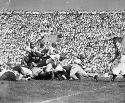 Full back John Morton of the Frogs plunges three yards over the backs of friends and foes in the second period at Lawrence. The Frog directly under Morton is Guard Alton Taylor, while standing in center background is End, Wilson George. George scored winning touchdown in fourth. Published in Fort Worth Star-Telegram morning edition September 24, 1950.