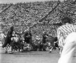 Johnny Dunn, senior halfback from Stephenville, who has established himself as Texas Christian University leading ground gainer with net of 149 yards on 25 carries, on average of 5.92, in two games shows form. Published in Fort Worth Star-Telegram evening edition October 6, 1950.