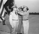 Colonel Eugene P. Seltzer, commanding the reserve 358th Infantry Regiment, affixes the fourragere, signifying the Croix de Guerre, to the epaulet of Captain James R. Shute. Rear, Lieutenant Paul J. Snelus received the Bronze Star. The wartime decorations for the two reserve officers had just recently came through.