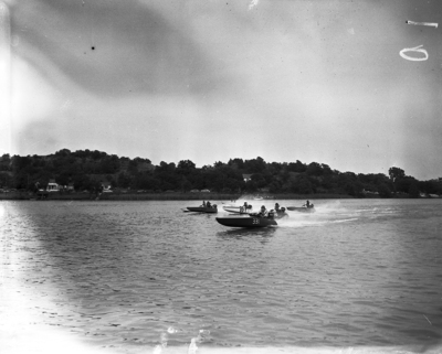 Fort Worth's Pete McDonald (331) leads this BU heat in Southwest Outboard regatta at lake Worth, but Dallas' John Russell (33-t) won. Sponsoring Peninsula Club planed bigger and earlier regatta. Published in the Fort Worth Star - Telegram evening edition, September 26, 1950.