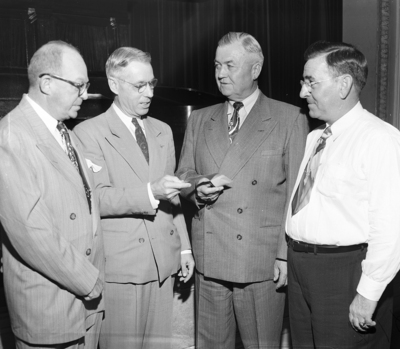 J. Rollie Pray of Fort Worth, second from left, receives a $4856 check from M. W. Stalnaker of Amarillo as Amarillo's quota for the "Texas Elks Club Crippled Children's Hospital Fund." The presentation took place at a district meeting. Looking on, at the left, is H. S. Rubenstein of Brenham, secretary of the Texas Elks State Association, and at the right, C. G. Barrett of Amarillo, vice president of the state association.