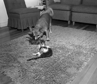 Tink, the part-Chow dog of Mrs. James W. Brown, is the family kitten-sitter while Mrs. Brown is away. At first Tink only tended the family's two kittens, but later the pup found another which she took home.