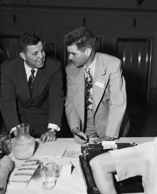 Dr. A. D. Major of Nocona, left, and Dr. J. A. Hallmark of Fort Worth are shown as they registered for the Texas Academy of General Practice scientific session at Fort Worth. Hallmark was president of the academy's Tarrant County chapter. Published in the Fort Worth Star - Telegram morning edition, September 26, 1950.