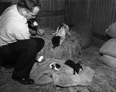 A mother dog explains to her active puppies that they may be able to spend "their week" in homes instead of as guests of the city pound where there were born. Published in the Fort Worth Star - Telegram evening edition, September 27, 1950.