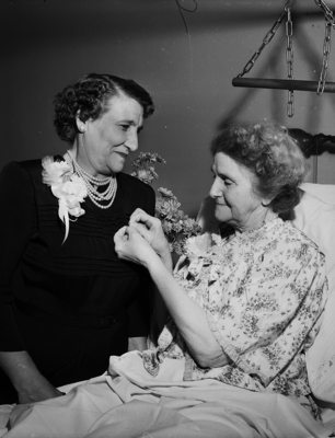 Mrs. J. S. McRoberts, right, incoming president of the Gold Star Mothers of Tarrant County, pins a past president's pin on Mrs. F. G. Howell, retiring president, during installation services held at Harris Hospital, where Mrs. McRoberts was suffering from a broken kneecap. Published in the Fort Worth Star - Telegram evening edition, September 29, 1950.
