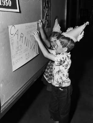 Two first-graders at Denver Avenue Elementary School, J. H. Garner and Cleva Fay Cotant, tack up a poster announcing the school's annual carnival. J. H. is the son of Mr. and Mrs. Carl Garner, 1503 Harrington, and Cleva Fay is the daughter of Mr. and Mrs. Jack Cotant, 1312-B Lincoln. Published in the Fort Worth Star - Telegram evening edition, September 28, 1950.