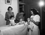 Mrs. Rose Phillips, right, feeds Rudy Longoria at St. Teresa's Home, while Mrs. Warren Sorrels, left, dresses Rosalyn Phillips, and Mrs. W. B. Duke, center, combs the hair of Gary Smith. Published in the Fort Worth Star - Telegram morning edition, October 1, 1950.